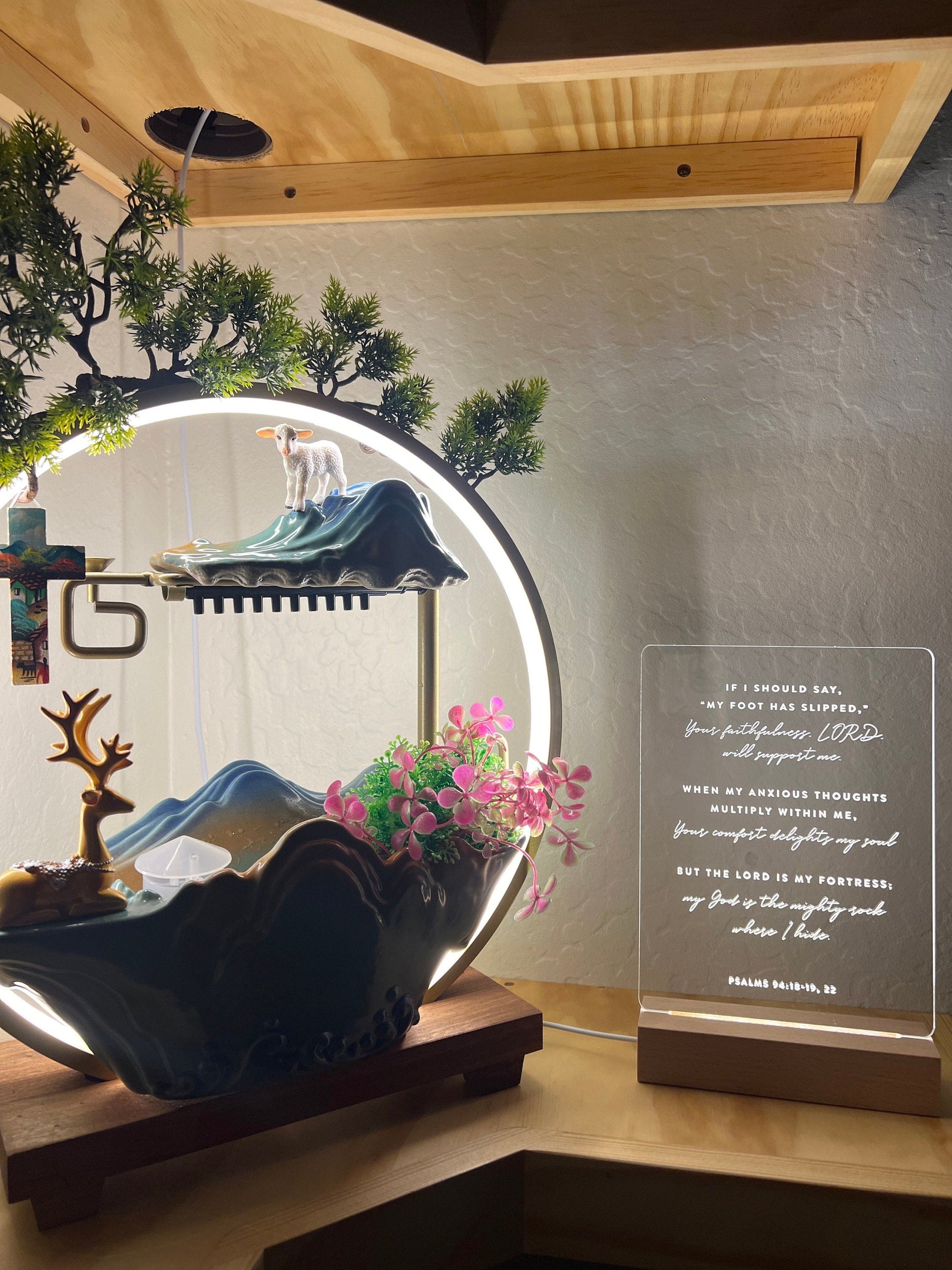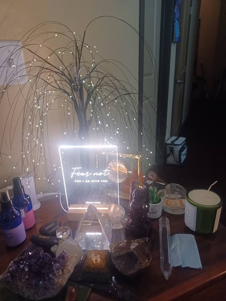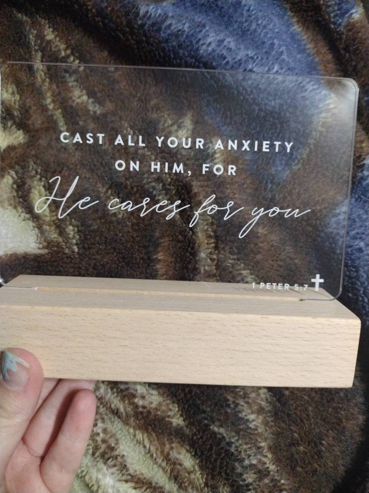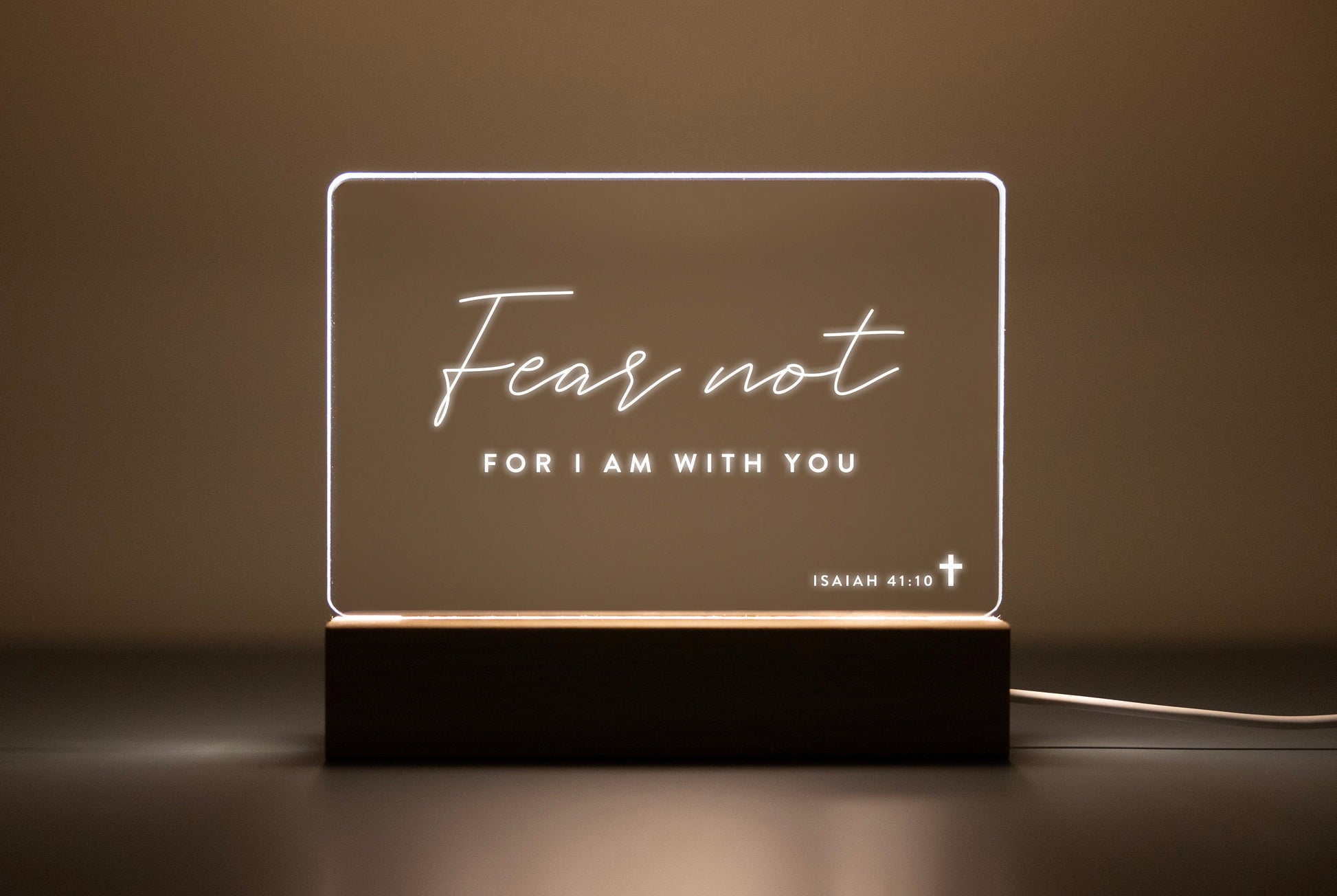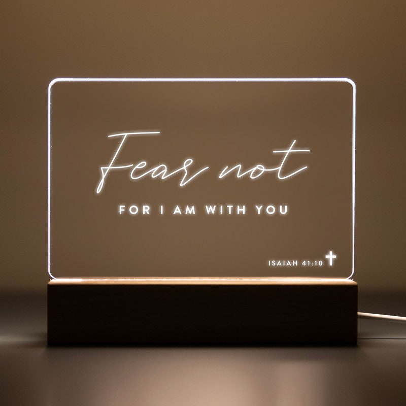 Illuminate your home with the warm glow of faith with our Bible Verse LED light. Choose from a pre-selected bible verse or personalize it with your own favorite scripture. The clear acrylic design and wooden light-up base make it a stylish and modern addition to any room. Perfect for those who seek comfort and inspiration in their daily lives.