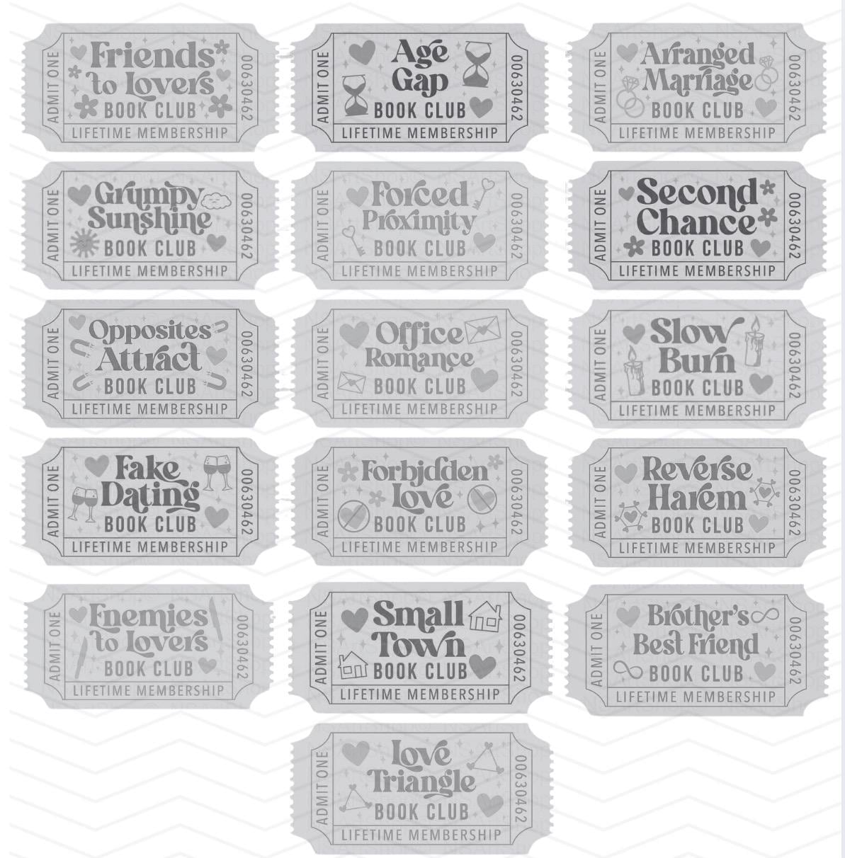 Hiii Book Babes ❤️ Are you ready to dive into your next reading adventure with our exclusive book club ticket leaner?! Our Bookclub ticket features 16 different tropes! Crafted from high-quality 1/8 acrylic, each ticket is beautifully engraved and paint-filled, ensuring a vibrant and eye-catching design. Whether you're a fan of Age age romance, Forbidden Love, Office Romance, or more, our bookish ticket leaner will not only grant you access to exciting discussions but also serve as a stylish keepsake for your literary journey 📚