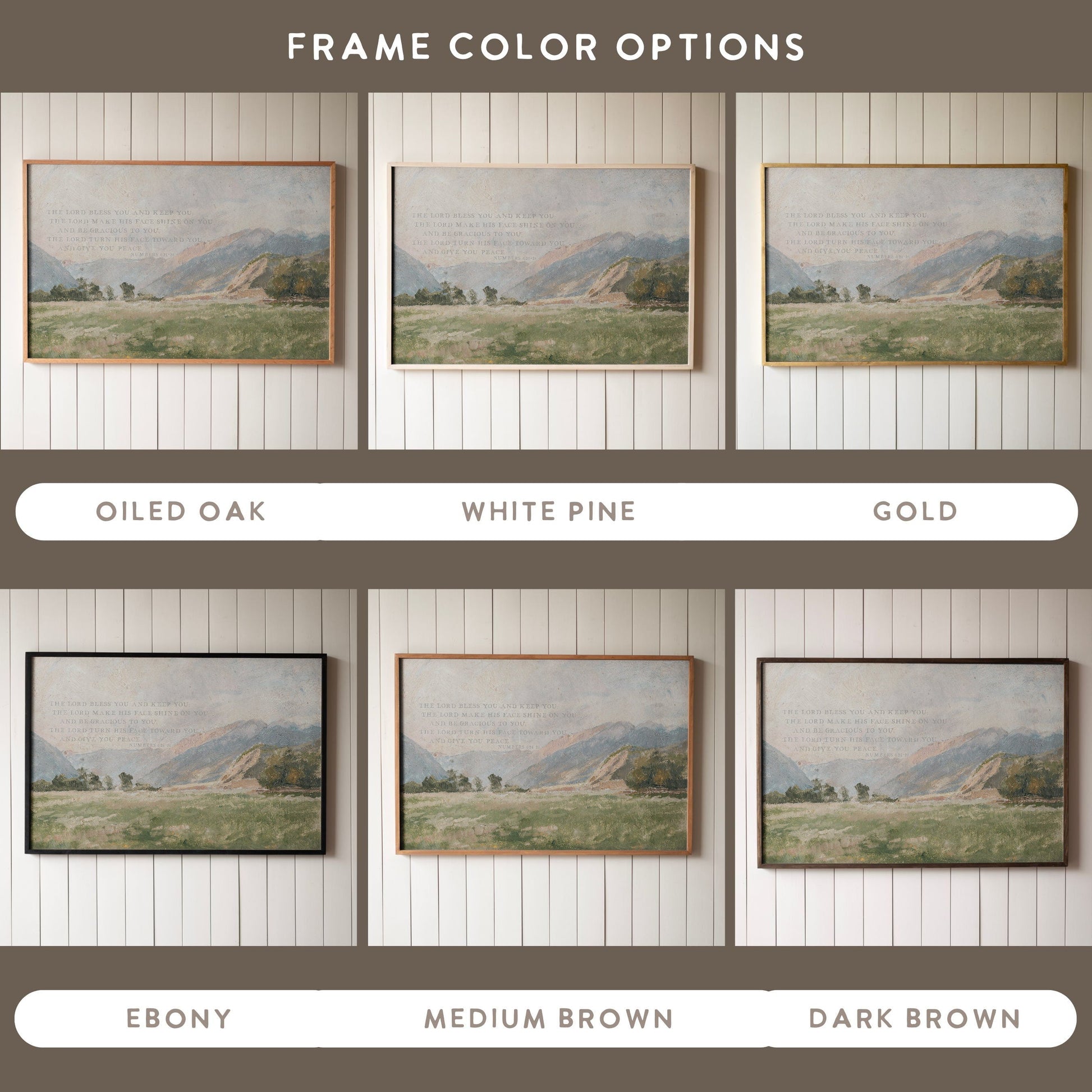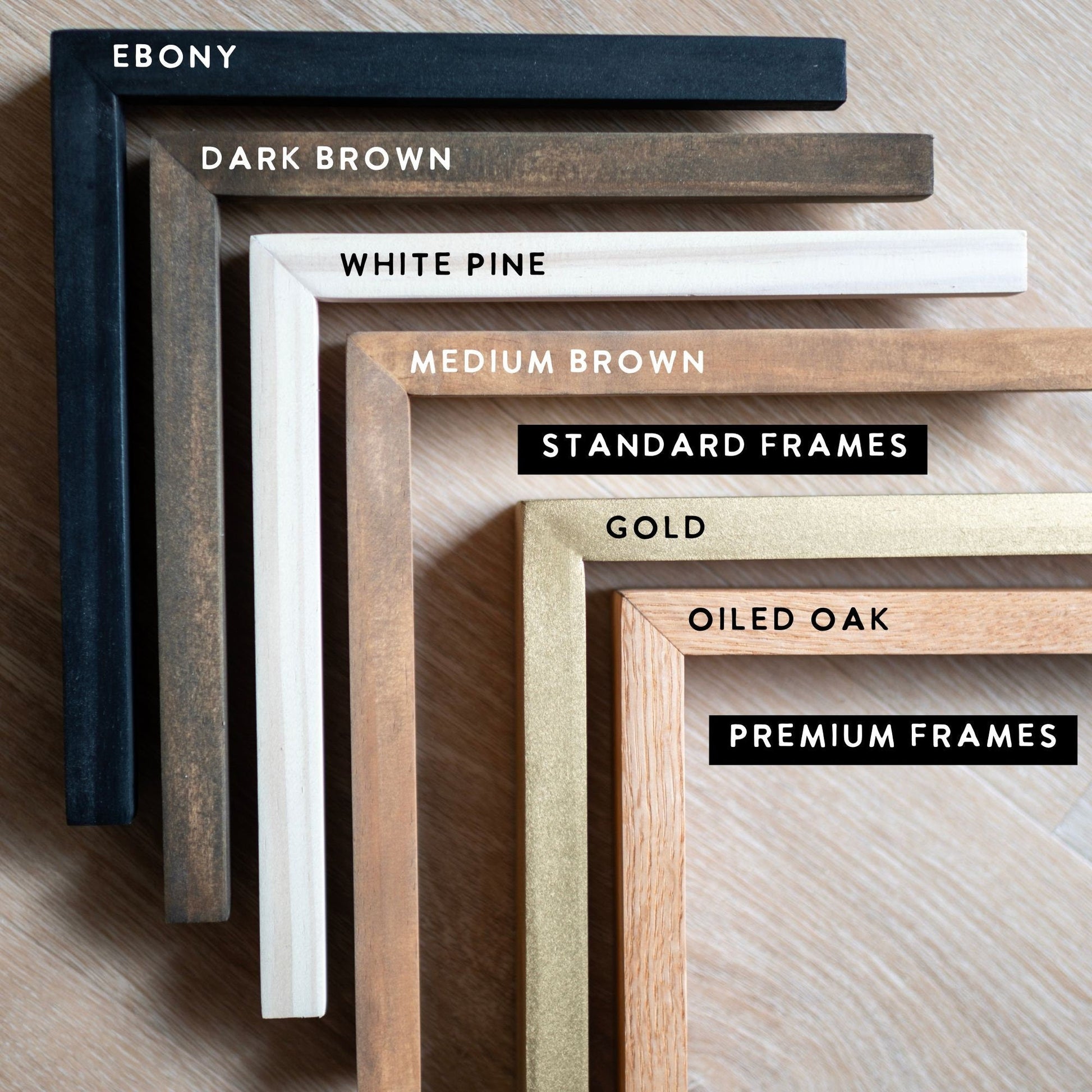 -We have six frame options. Five of them are stained premium pine or painted gold metallic. We also have a hardwood oak option that is lightly oiled for a natural wood look. Please note for the oak frame option: As with all oak, the color can vary a little as it is oiled and not stained. The oil brings out the color of each individual piece of wood we use.