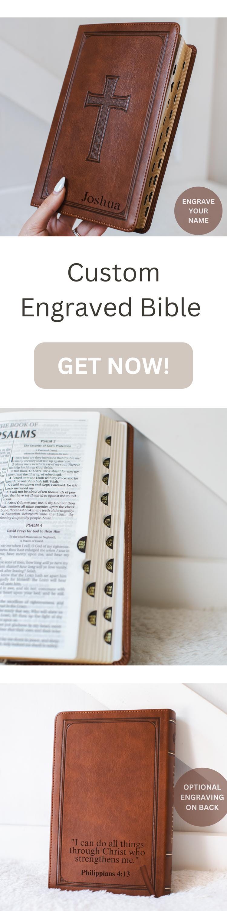 This Custom Engraved Bible makes a meaningful Personalized Christian Gift for Baptism or any special occasion. Our Custom Name Engraved KJV Bible for Men and Women is also a thoughtful Gift for Confirmation and a treasured Custom Bible keepsake.