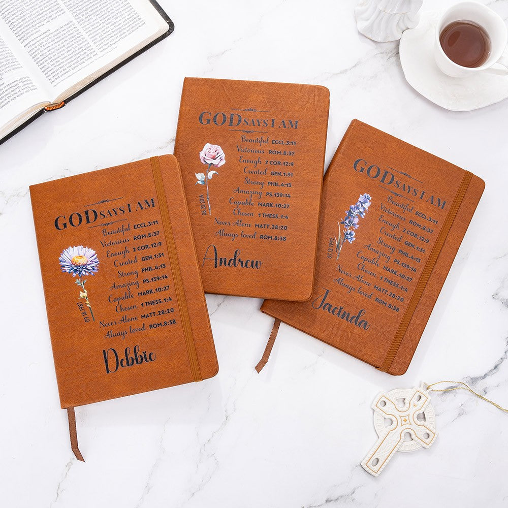 Custom Prayer Journal with Name & Birth Flower, God Says I Am Positive Affirmations Leather Notebook, Graduation/Birthday/Christmas/ Gift for Women