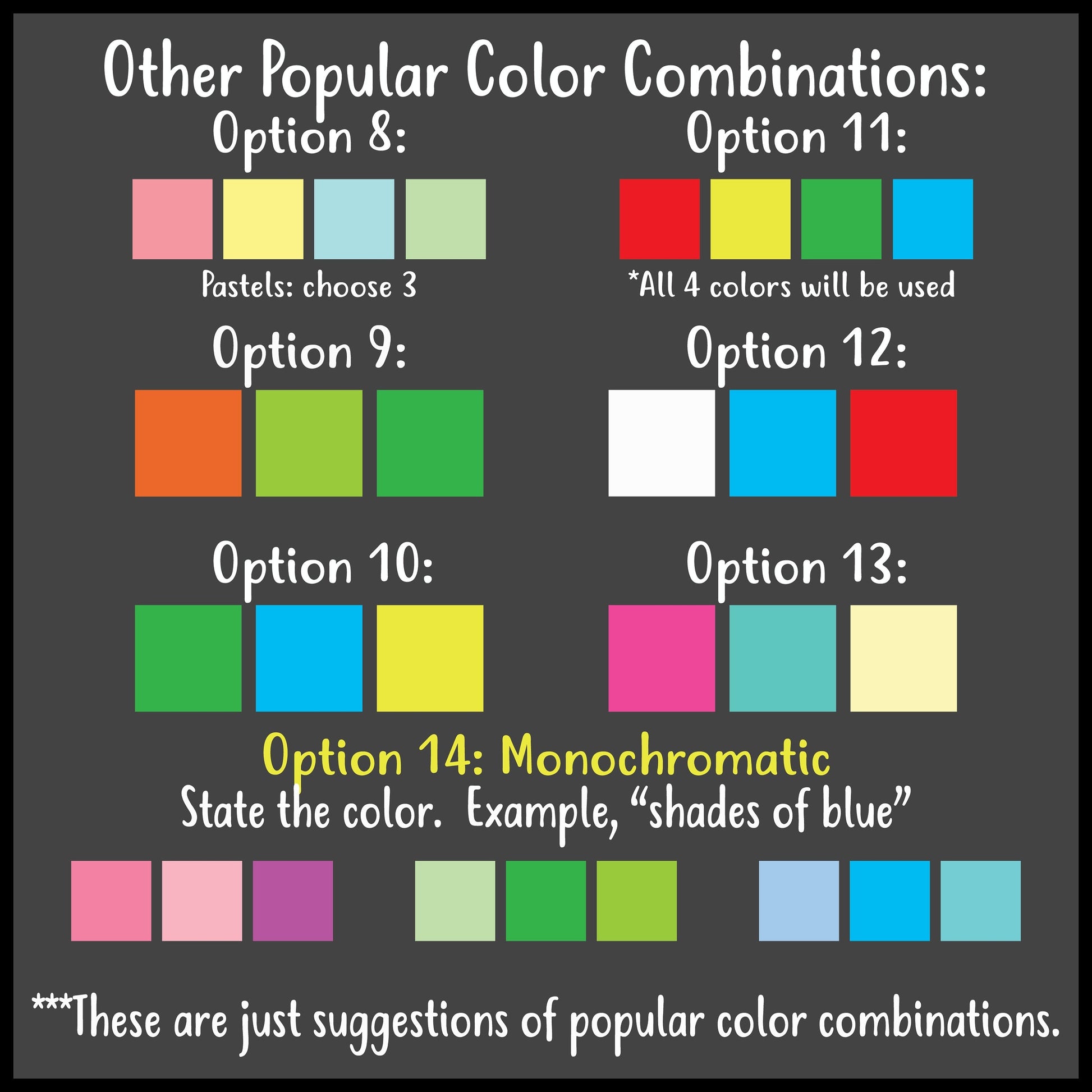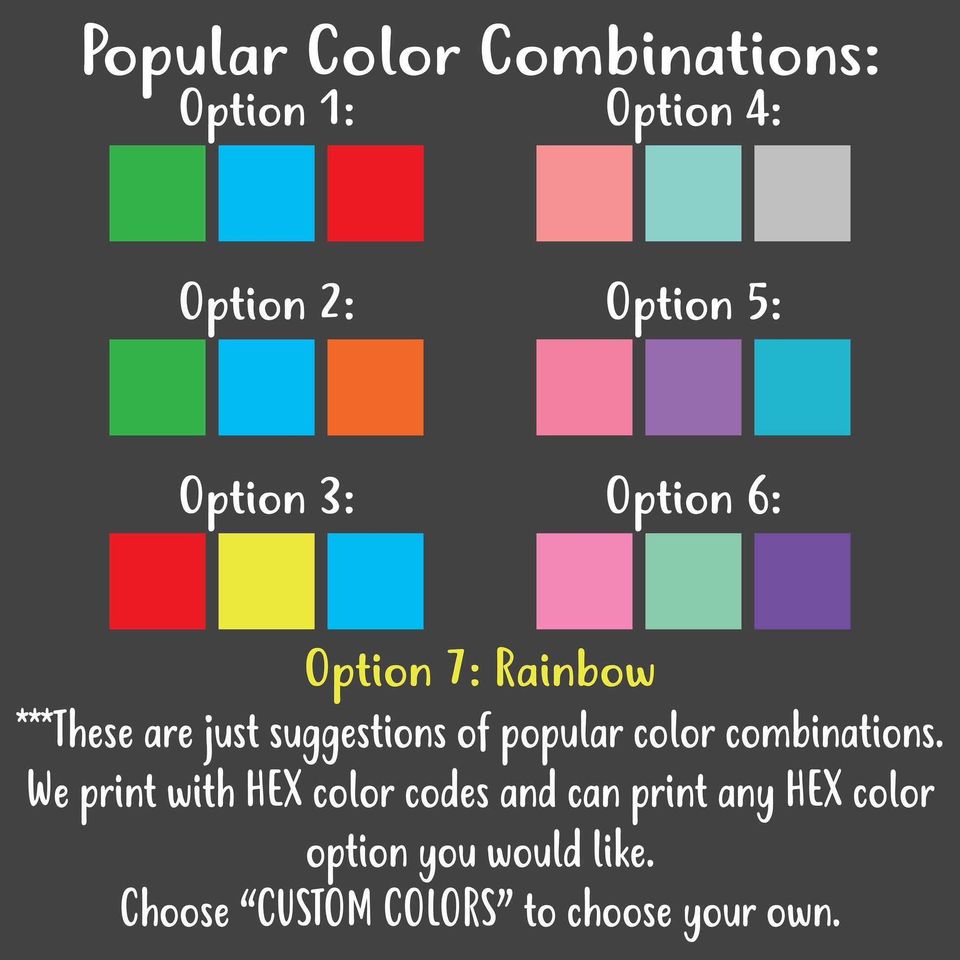 You choose your own three main colors and the rest of the design colors will remain the same. *Note: Brighter/lighter colors show up the best in pictures on the black chalkboard.