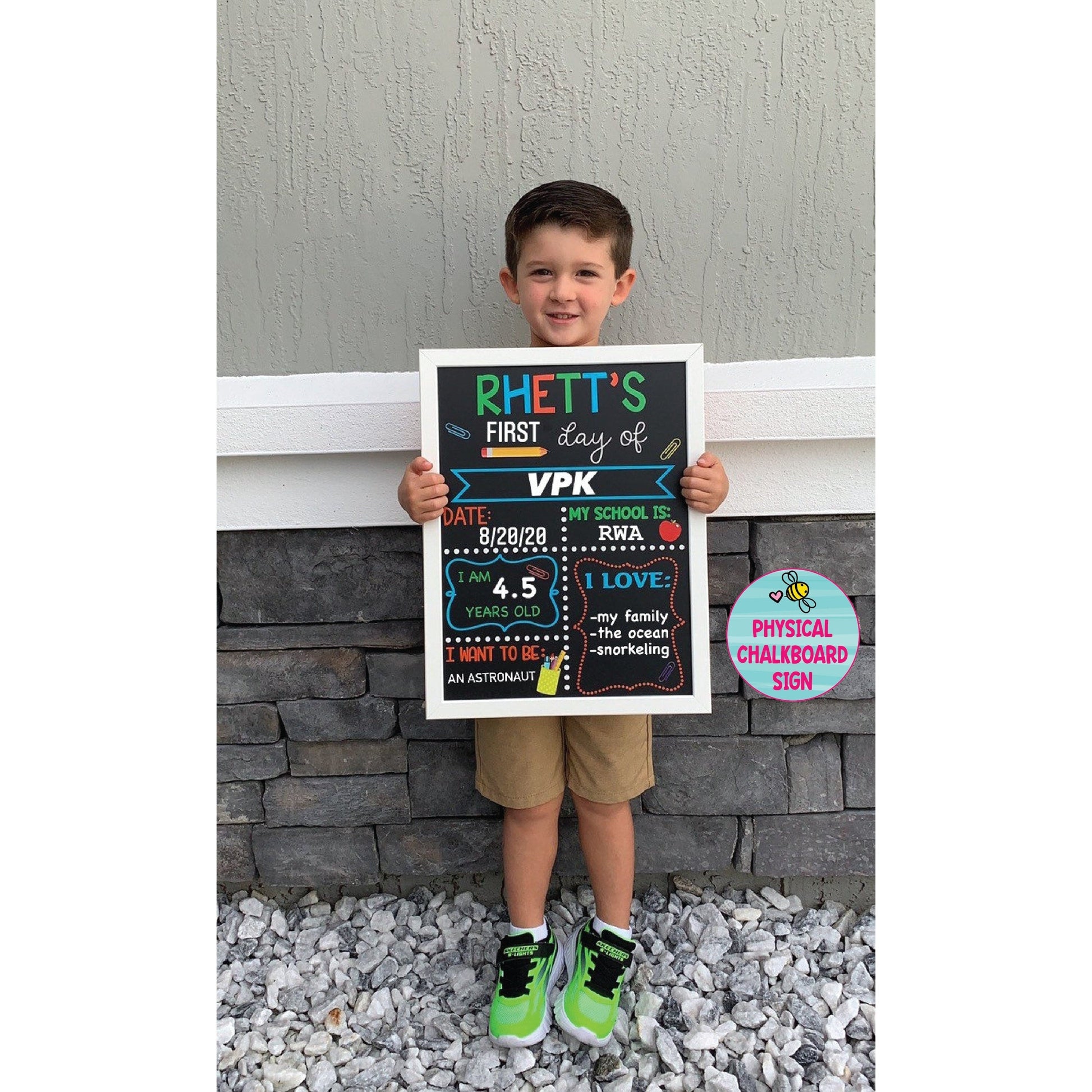 This reusable first and last day of school chalkboard sign comes custom printed (not a decal) with the name and template shown on an actual physical chalkboard. This chalkboard sign is a great back to school photo prop that you can use again at the end of the school year to document all of your child's milestones.