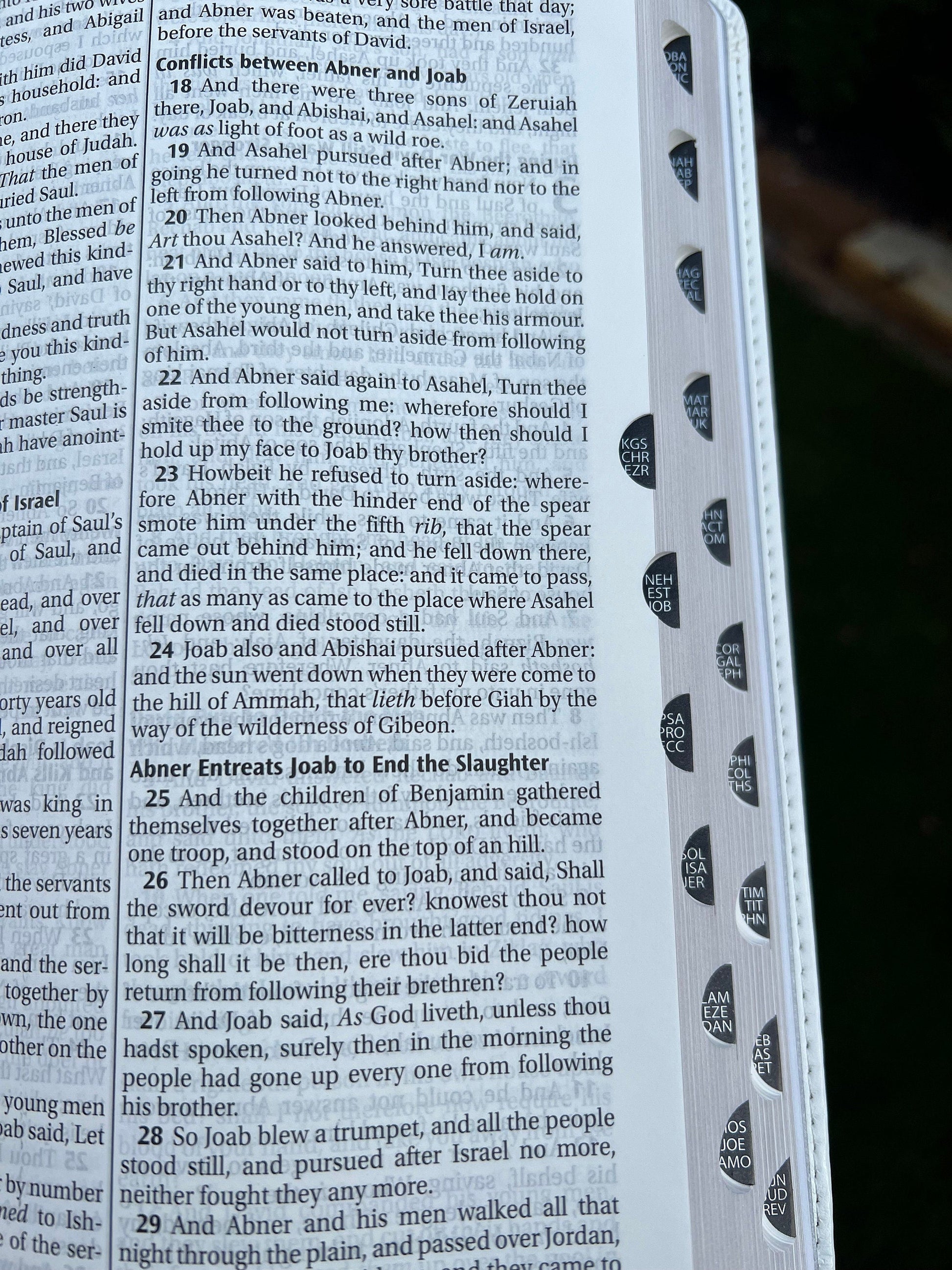 Celebrate the sacraments, rites and ceremonies of the Church with the White Faux Leather Large Print Thinline KJV Bible with Thumb Index! Whether you are celebrating a baptism, confirmation, church membership, first communion, christening, or wedding, the pure white KJV Bible will mark your rite of passage in a meaningful and memorable way.