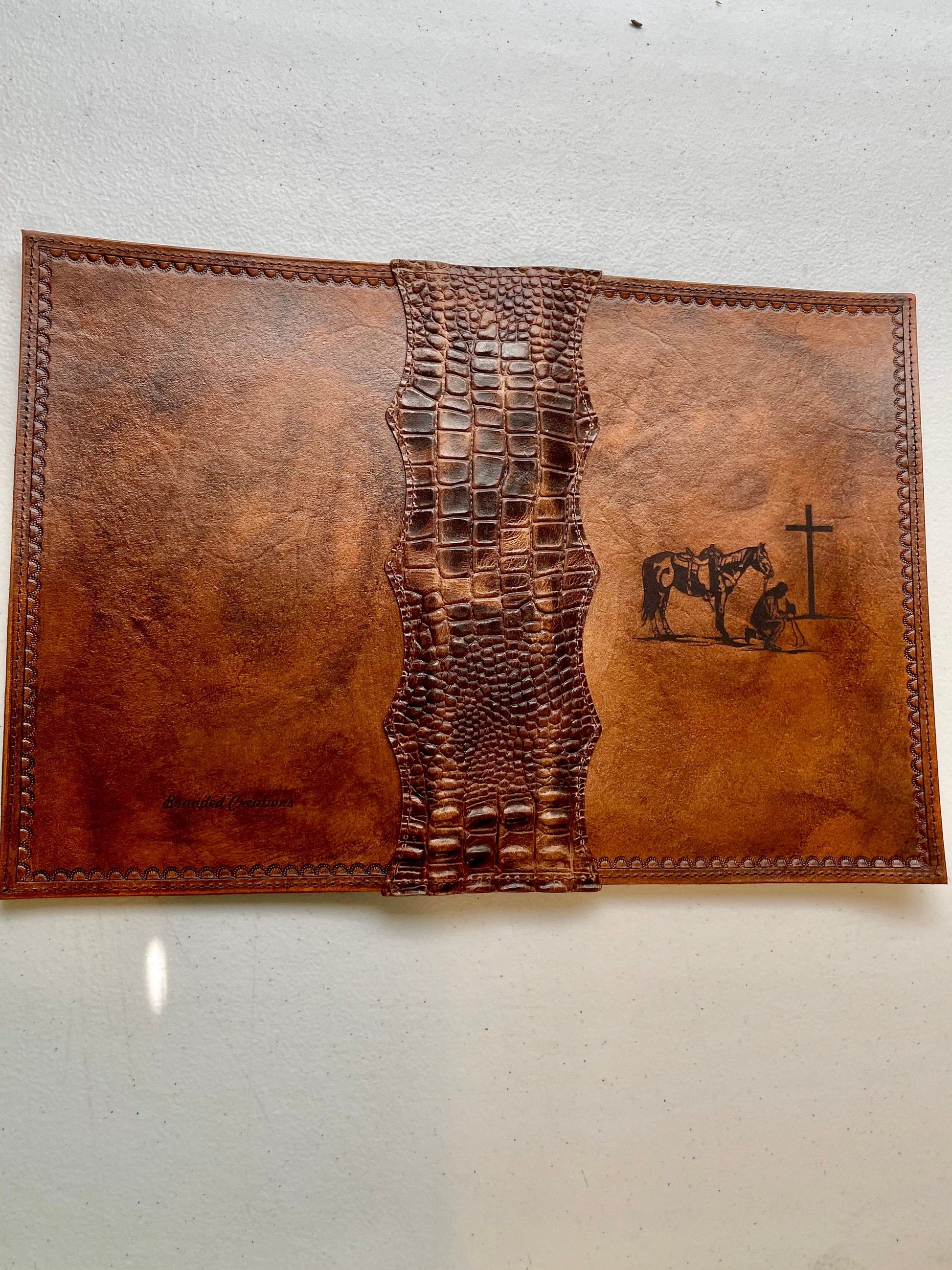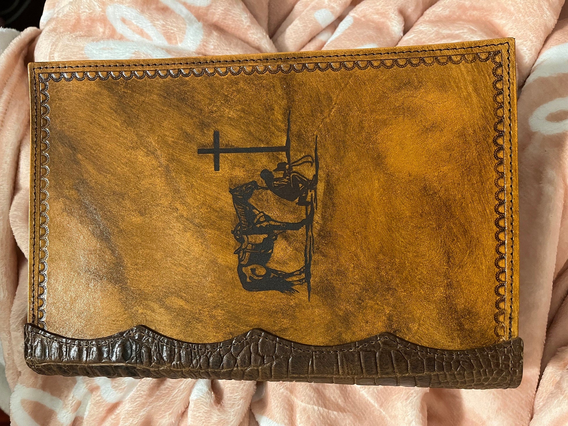 This is beautiful handcrafted all leather bible cover that has been laser engraved with a detailed Praying Cowboy design. The front and back are made from top grain leather with hand tooled edges and has been finished in an antique tan stain and features a chocolate alligator embossed leather bind. It will hold up to 9 3/4”x 6 3/8” x 2” soft bound bible. It has inner chap leather (suede) sleeves to hold bible in place with a pocket on sleeve. Customized engraving for an additional $20.00 is available. If I don't have a design you'd like please message me as I can do many other designs.