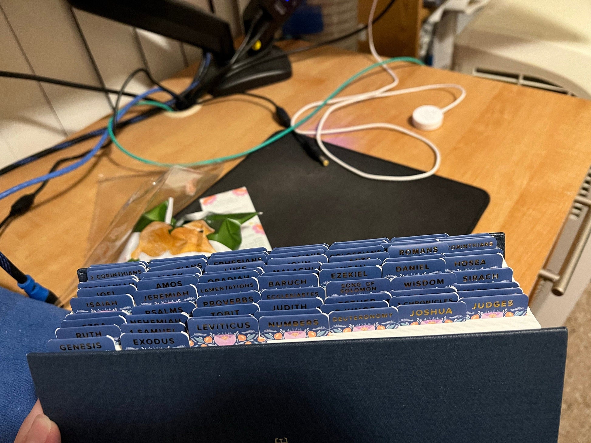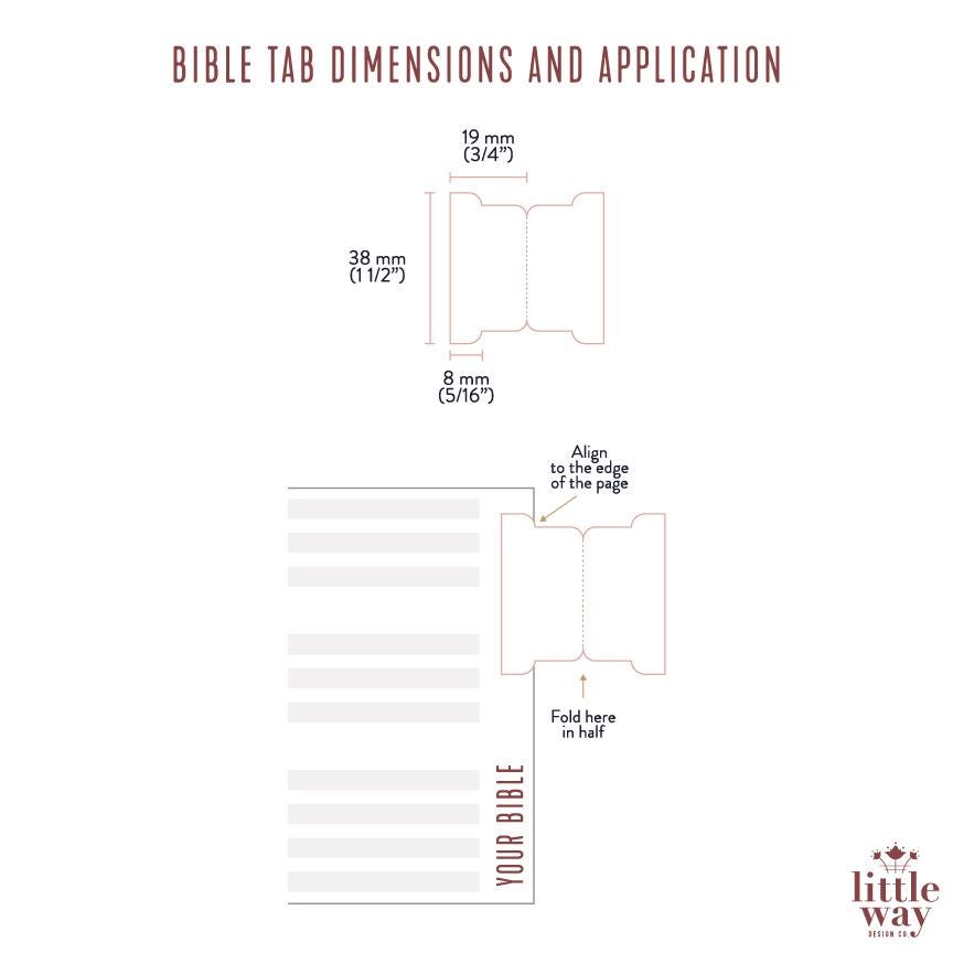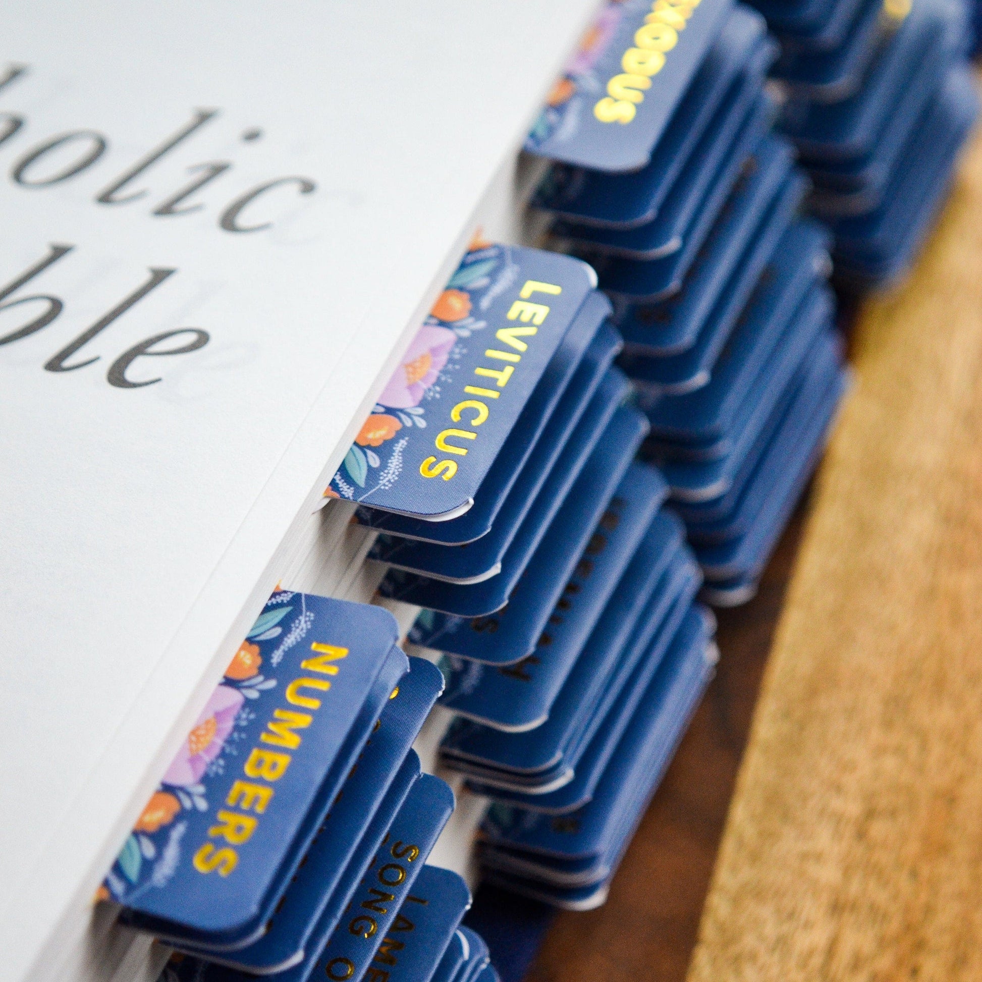 • 5 sheets with flexible, matte and coated tabs with gold foil accents and featuring our original floral design • Tabs for each of the 73 books of the Catholic canon (includes deuterocanonical books) • Two blank tabs that you can use for your Bible, planner, binder, or pad! • Guide and instructions for how to apply them