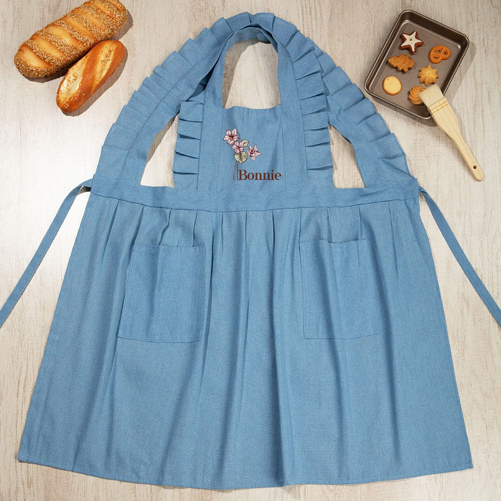 Personalized Birth Flower Ruffle Princess Apron with Pockets, Custom Name Apron for Kitchen/Garden/Nail Salon, Gifts for Chef/Manicurist/Gardener