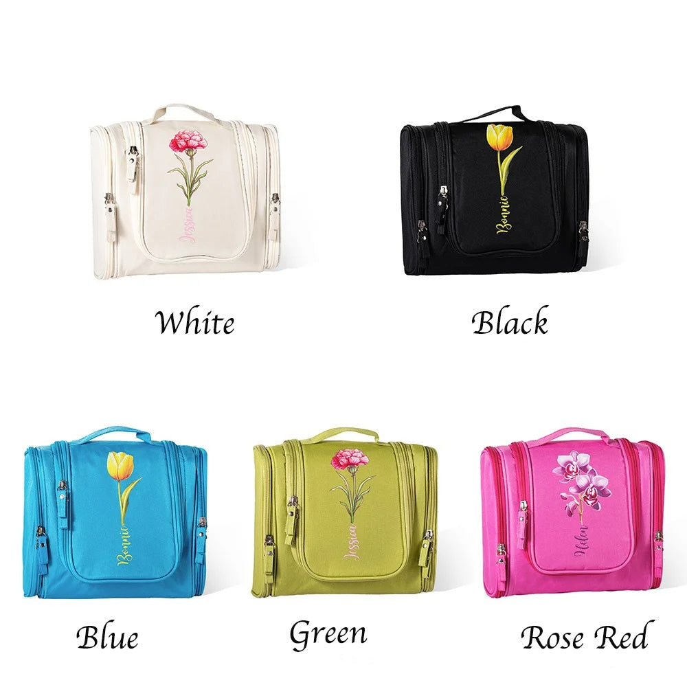 Personalized Name & Birth Flower Toiletry Bag, Travel Toiletry Organizer with Hanging Hook, Travel Accessories, Birthday Gift for Women/Wife/Her