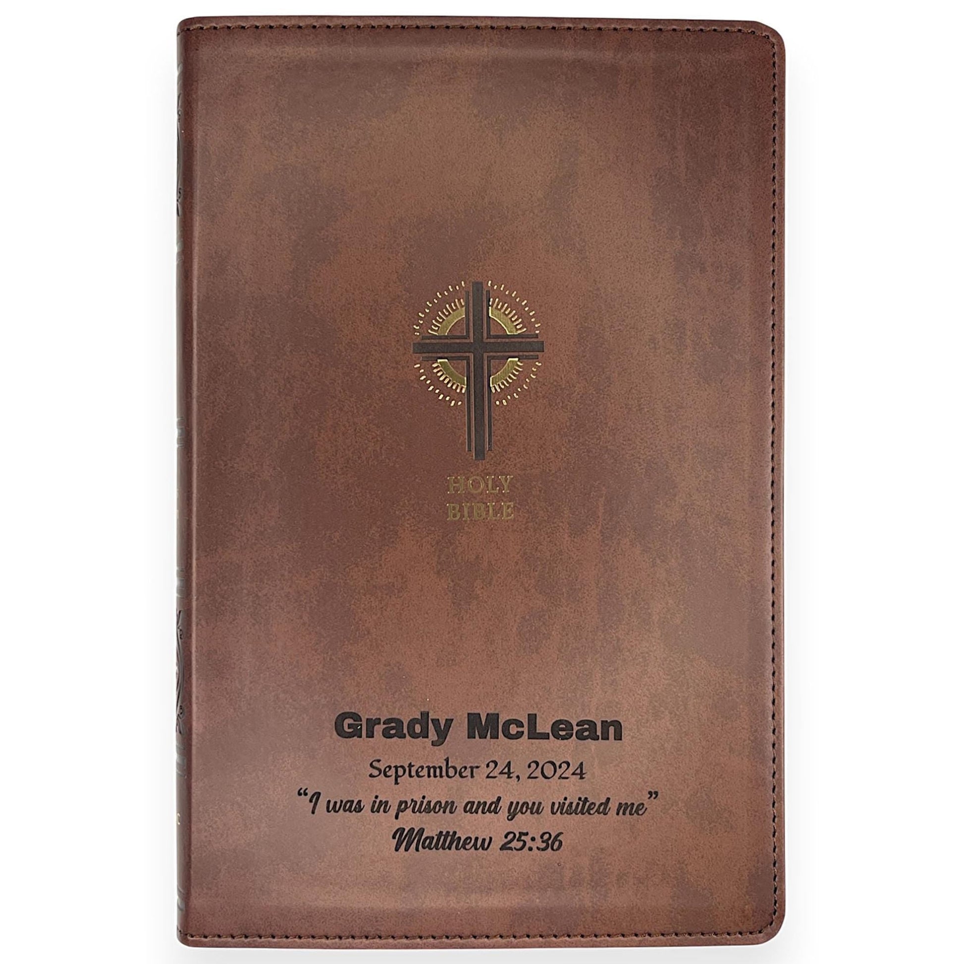 PERSONALIZED: Personalize the brown faux leather cover with up to 3 lines of text. You can add your name, a date, or a special message to make this Bible uniquely yours or an ideal gift for Catholic and religious events. The custom engraving color is dark brown/black.