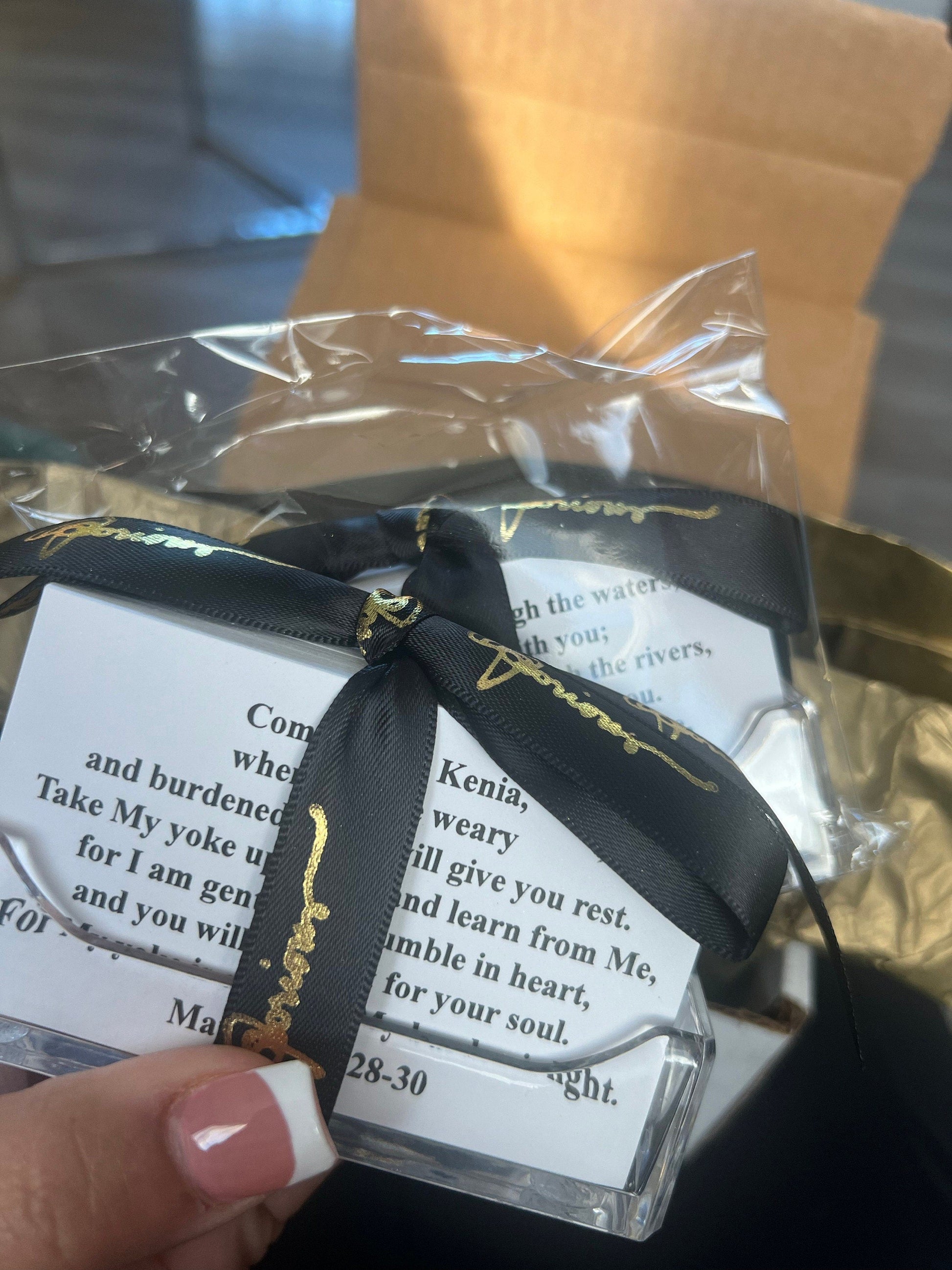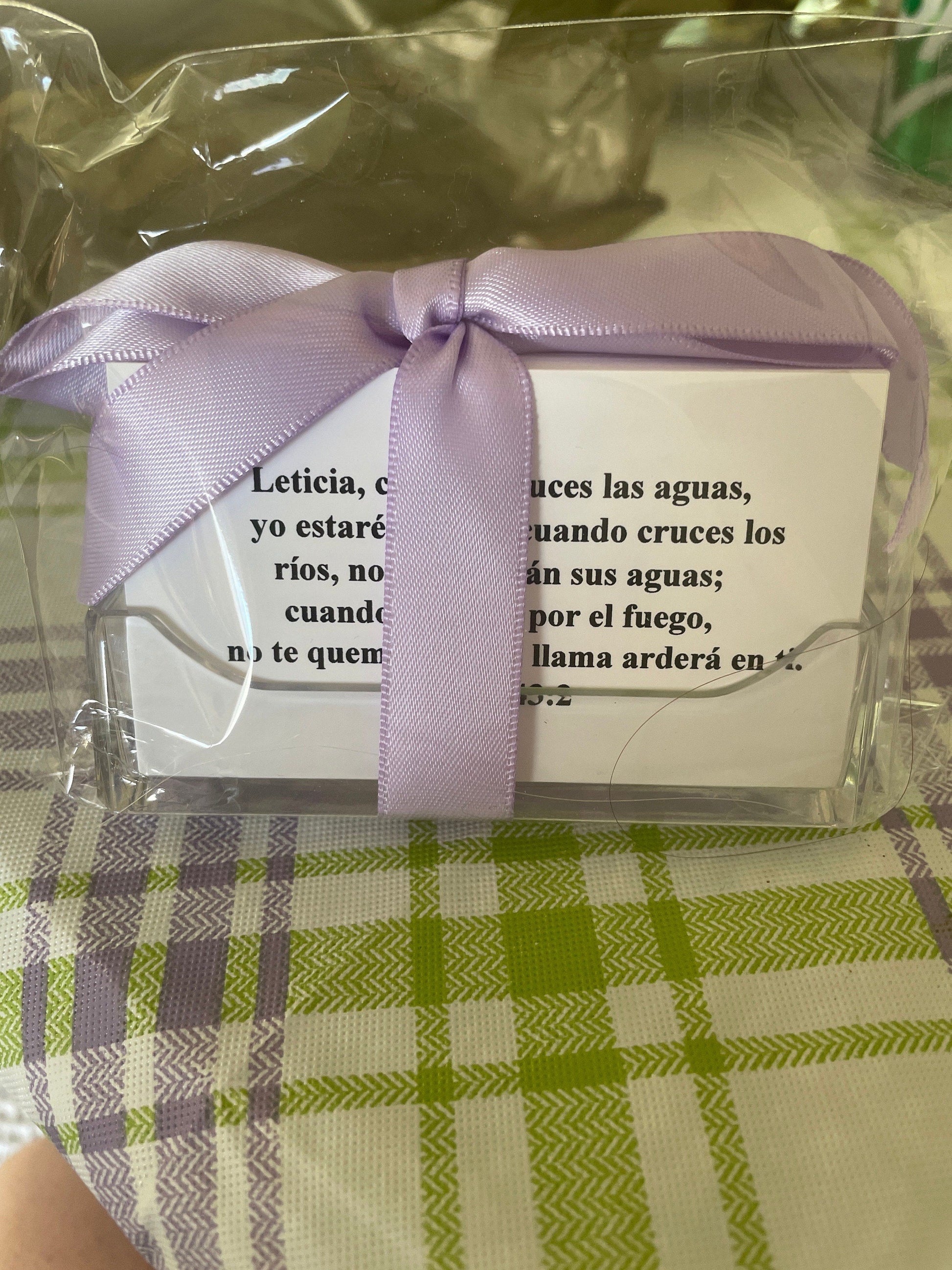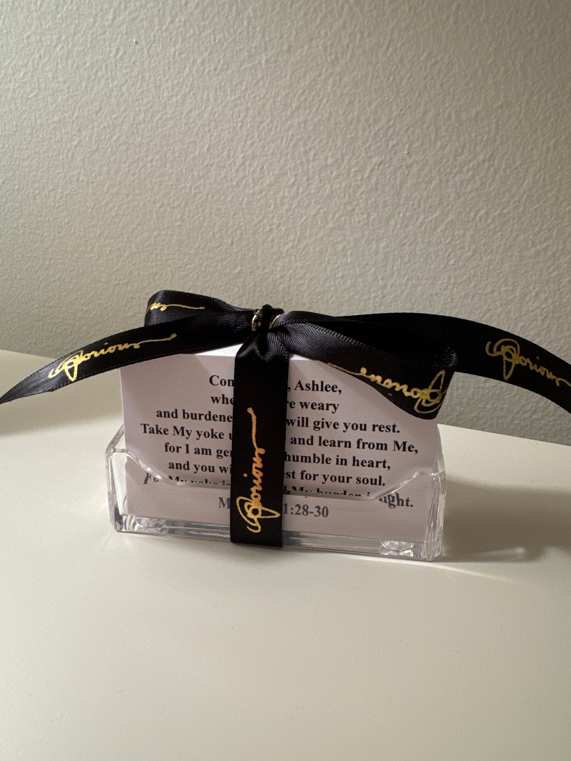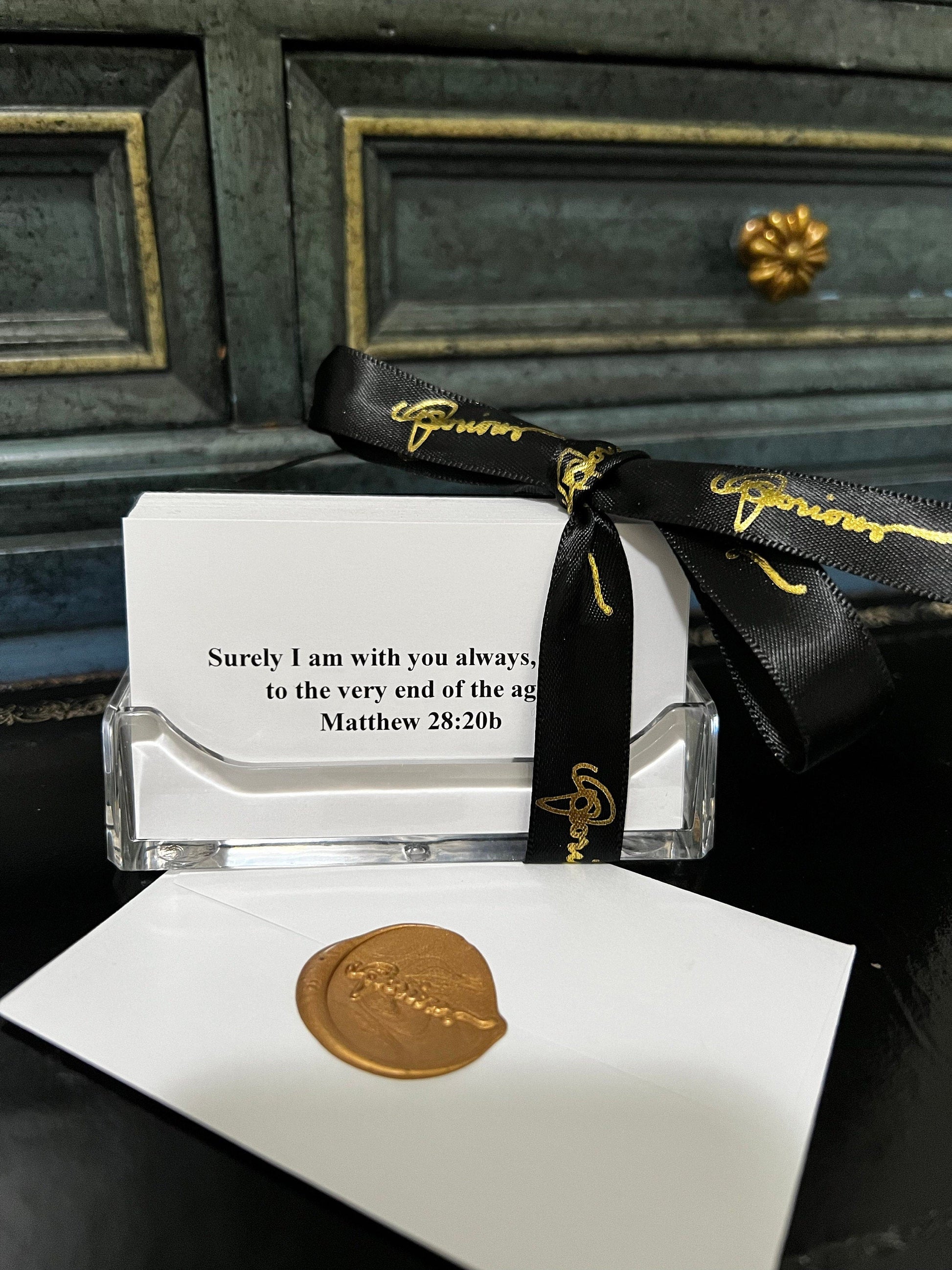 If you are looking for a meaningful gift, we have a lovely set of 50 personalized Bible Verses. Each verse is personalized with your name and printed on high quality 2"x 3 1/2" cards, in a clear lucite holder and tied with a ribbon.