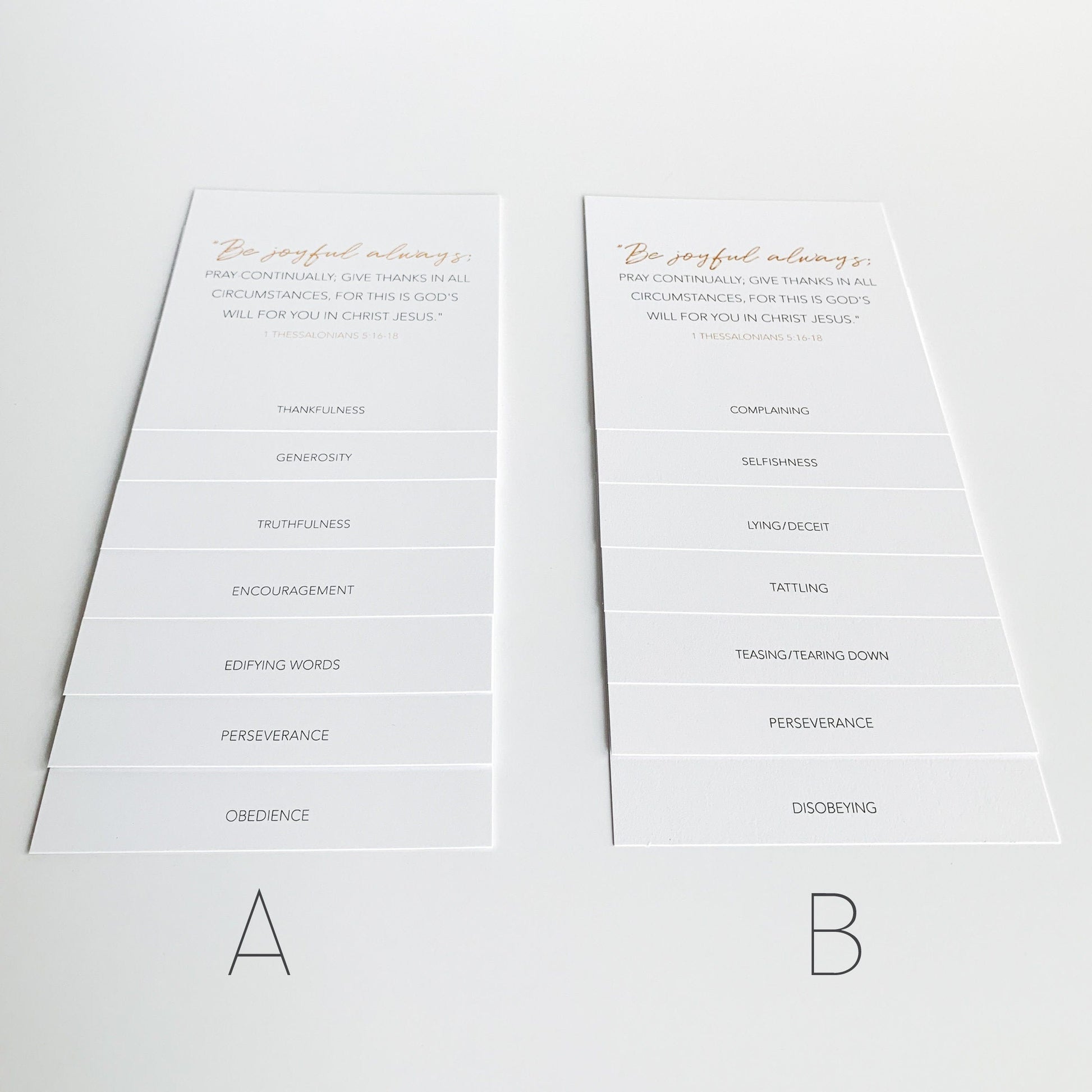 Card set includes scriptures that address tattling, complaining, selfishness, giving up, lying, teasing and disobeying. (Inspired by Wise Words for Moms by Ginger Hubbard)