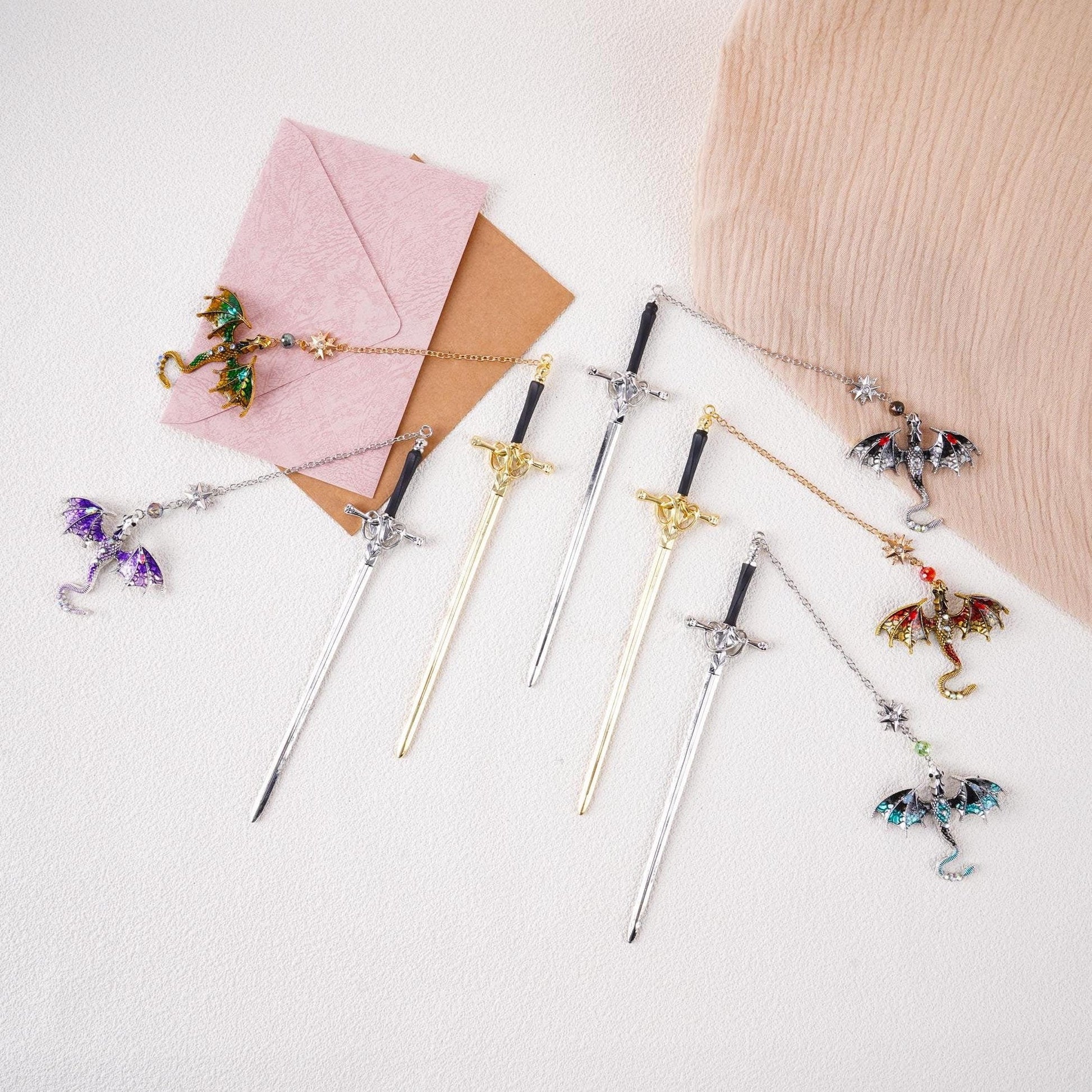 • Design Point: This exquisite bookmark collection features intricately designed dragons and swords, crafted from high-quality metal. The golden or silver dragons wrap around their matching swords, symbolizing strength, wisdom, and protection, making these bookmarks a perfect blend of elegance and mythology. These stylish bookmarks are perfect for marking your place in any novel, making them an ideal gift for avid readers.