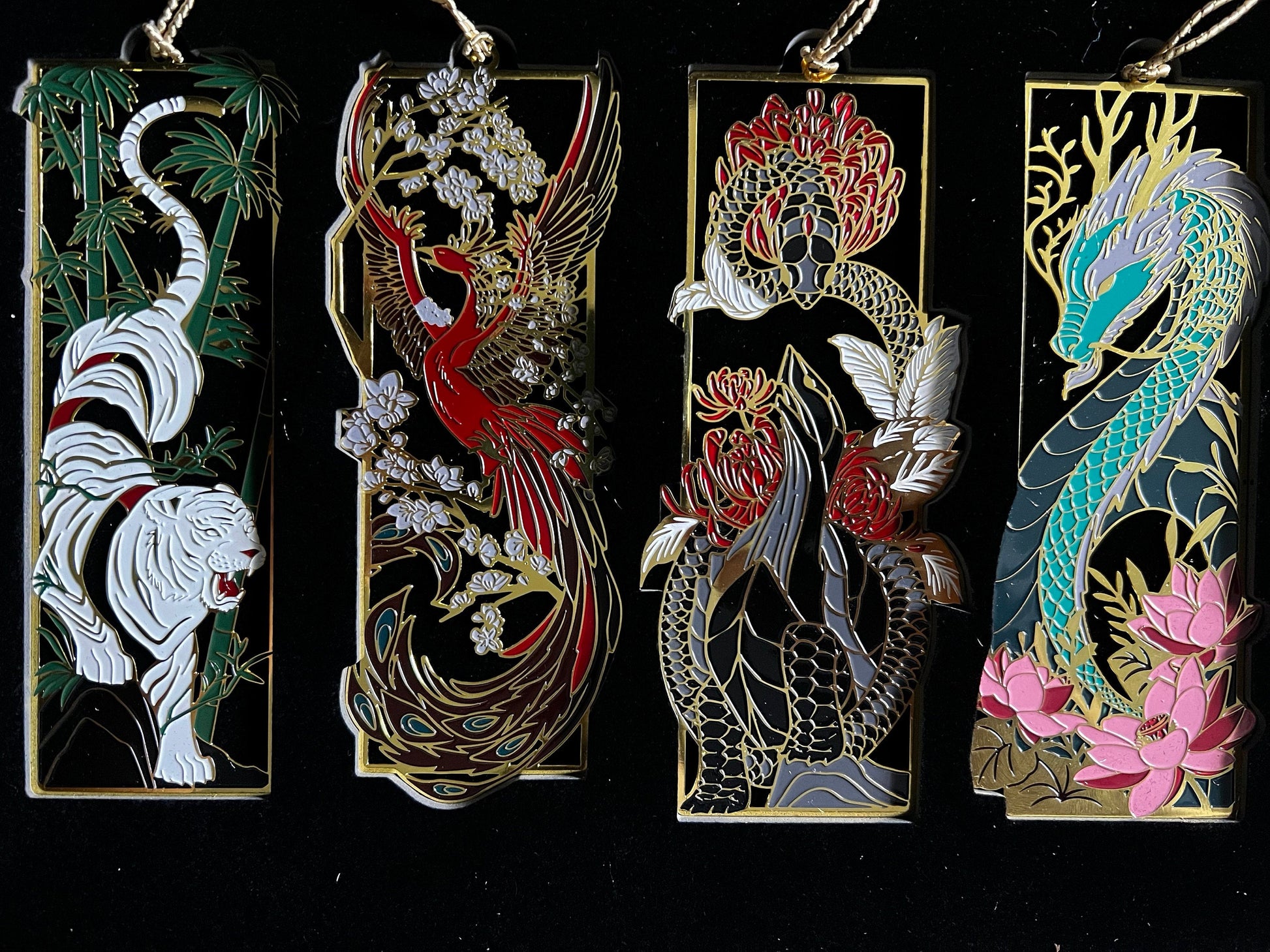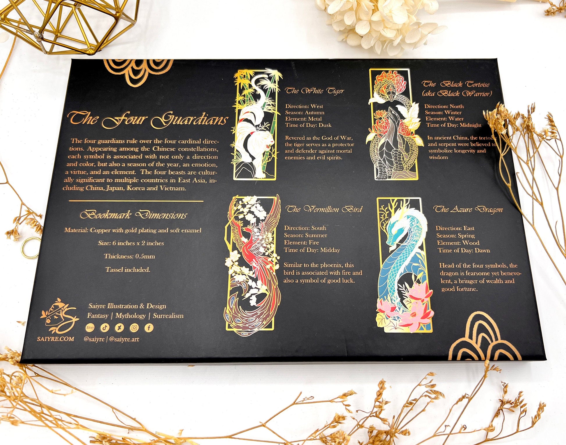 The Four Guardians is Saiyre’s latest series of original designed bookmarks. Based on the four guardians that rule over the four cardinal directions in Chinese mythology, each symbol is associated with not only a direction and color, but also seasons of the year, emotions, virtues, and elements. Full metal, laser etched, and soft enamel filled, these bookmarks are the perfect accessory and gift for any book lover. Please note that that this listing is for the complete set box only which features all four guardian designs as well as a fully original designed custom case. Individual bookmarks are available for purchase in a separate Etsy listing, please visit my page to locate that listing if you are looking for individual bookmark purchase only.