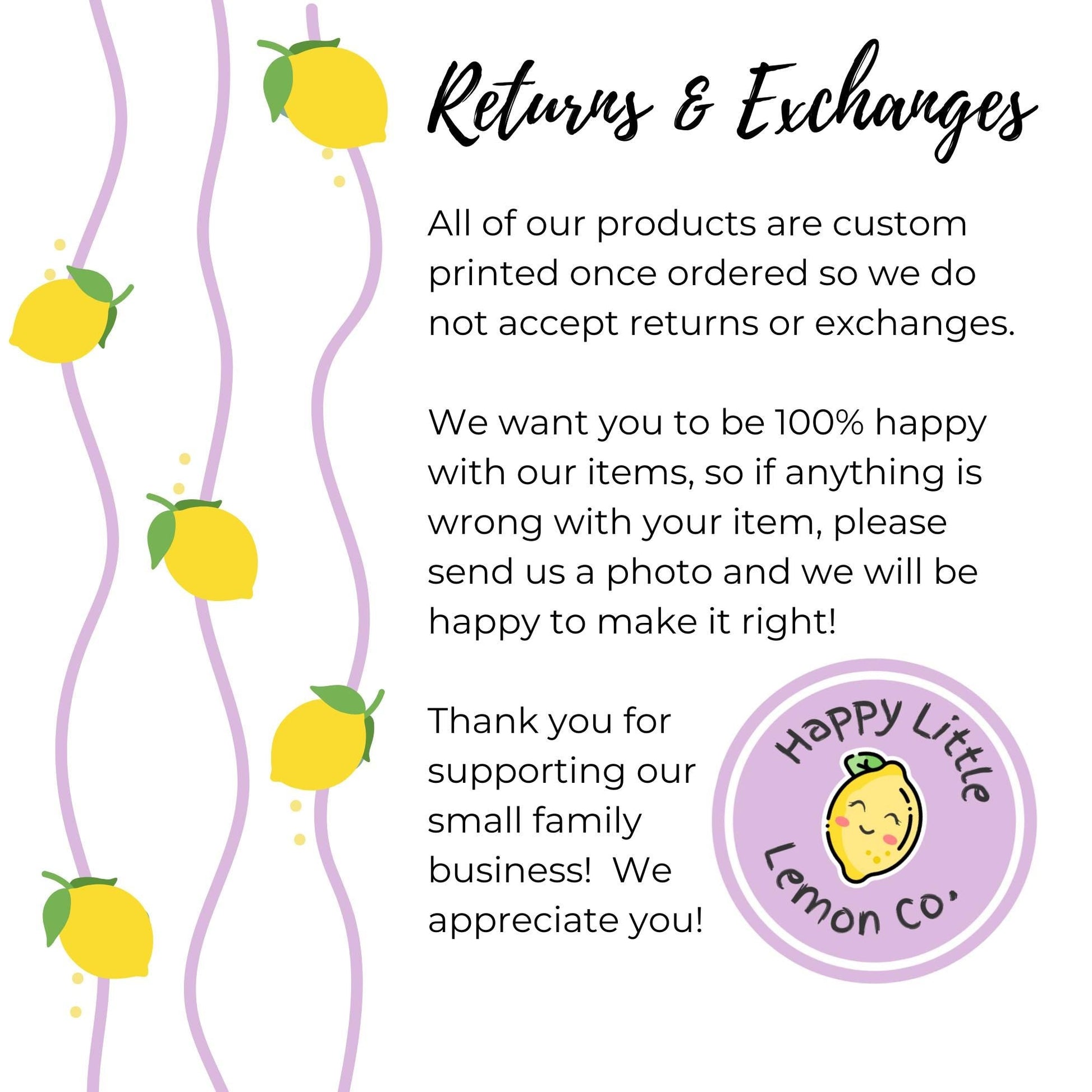 We do not offer returns or exchanges because our items are made to order. Please double check your selection before placing your order. If there is a quality problem with your item, please send a photo and we will do our best to make it right.